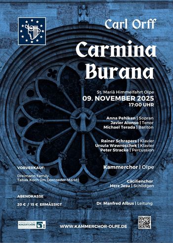 Der Kammerchor Olpe führt die Carmina Burana in Kooperation mit dem Cäcilienchor Herz Jesu aus Bergisch Gladbach-Schildgen auf. Unter der Leitung von Dr. Manfred Albus werden die beiden Ensembles die Fassung für gemischten Chor, Solisten, zwei Flügel und Schlagwerk in der hervorragenden Akustik der Olper Marienkirche zum Klingen bringen.